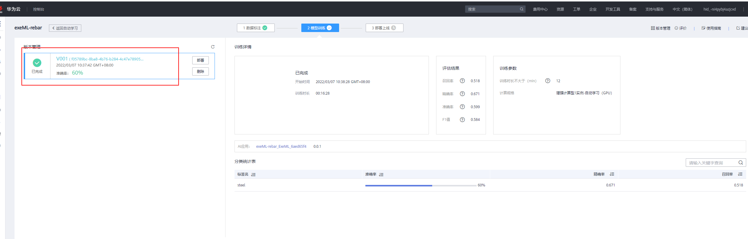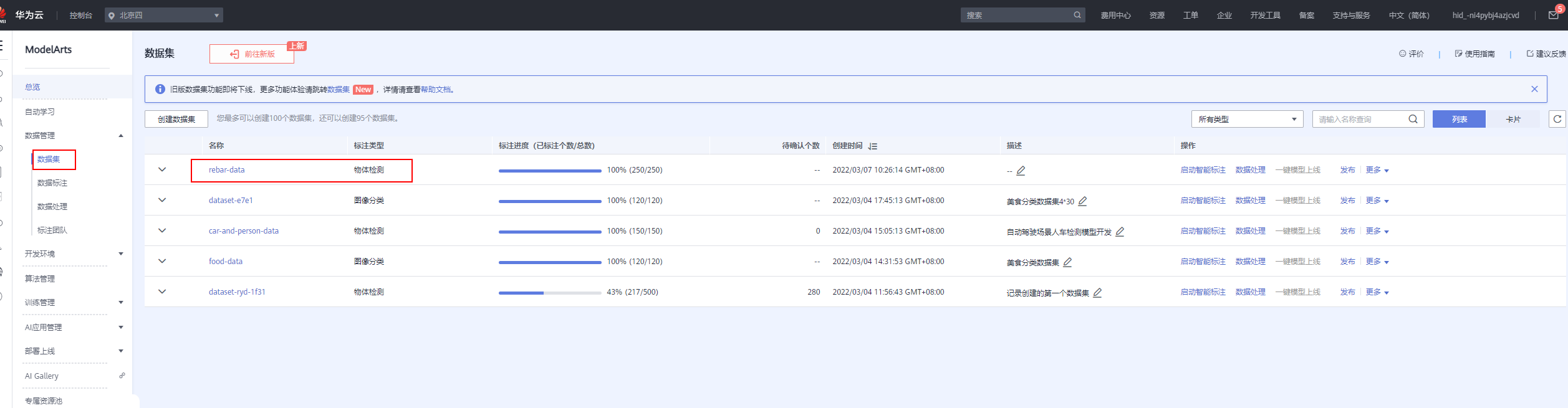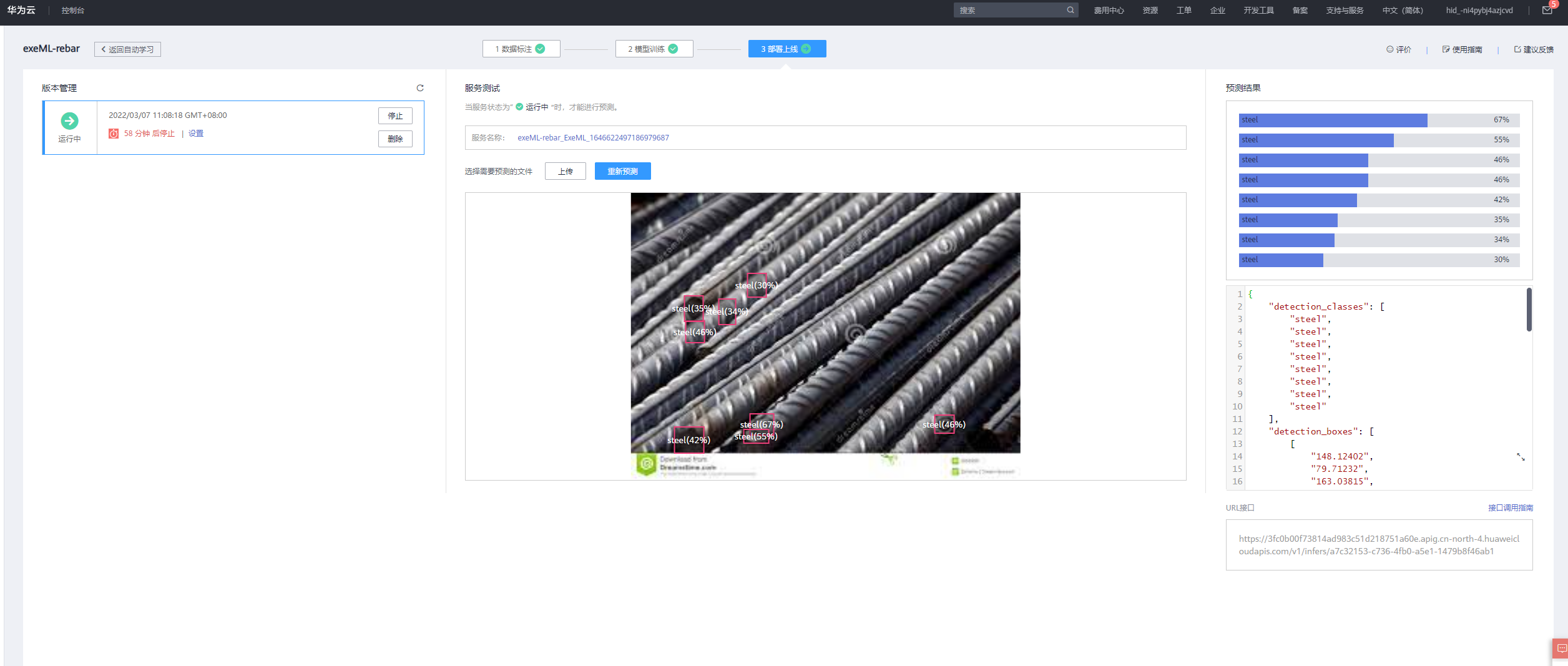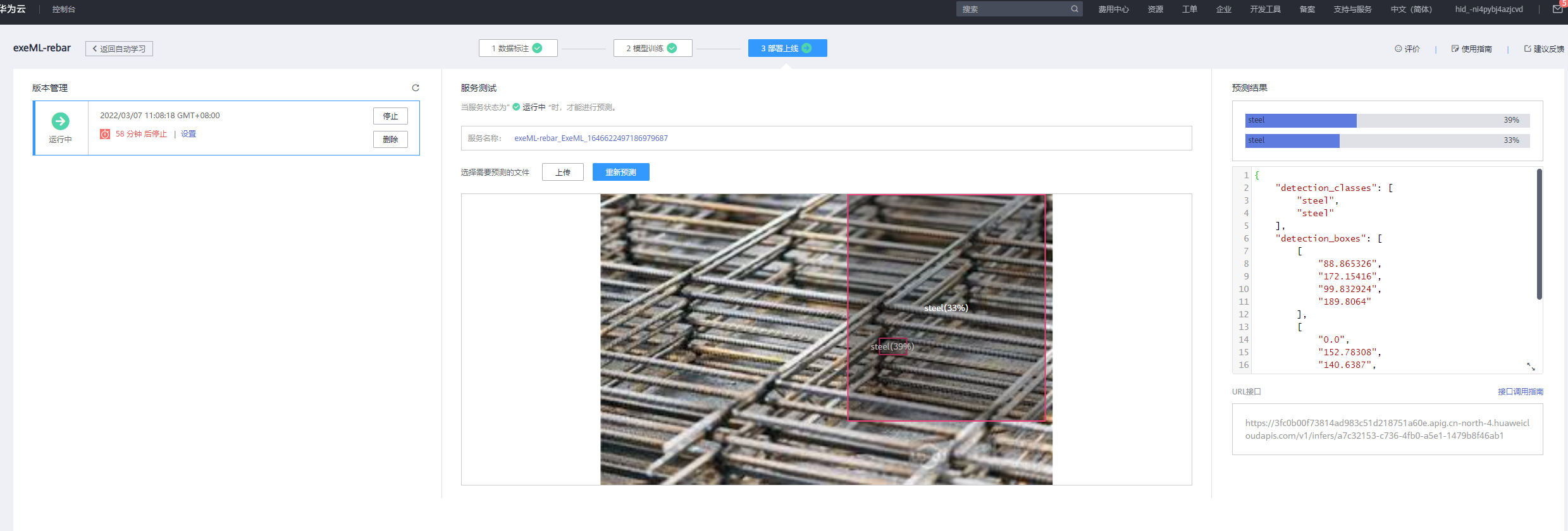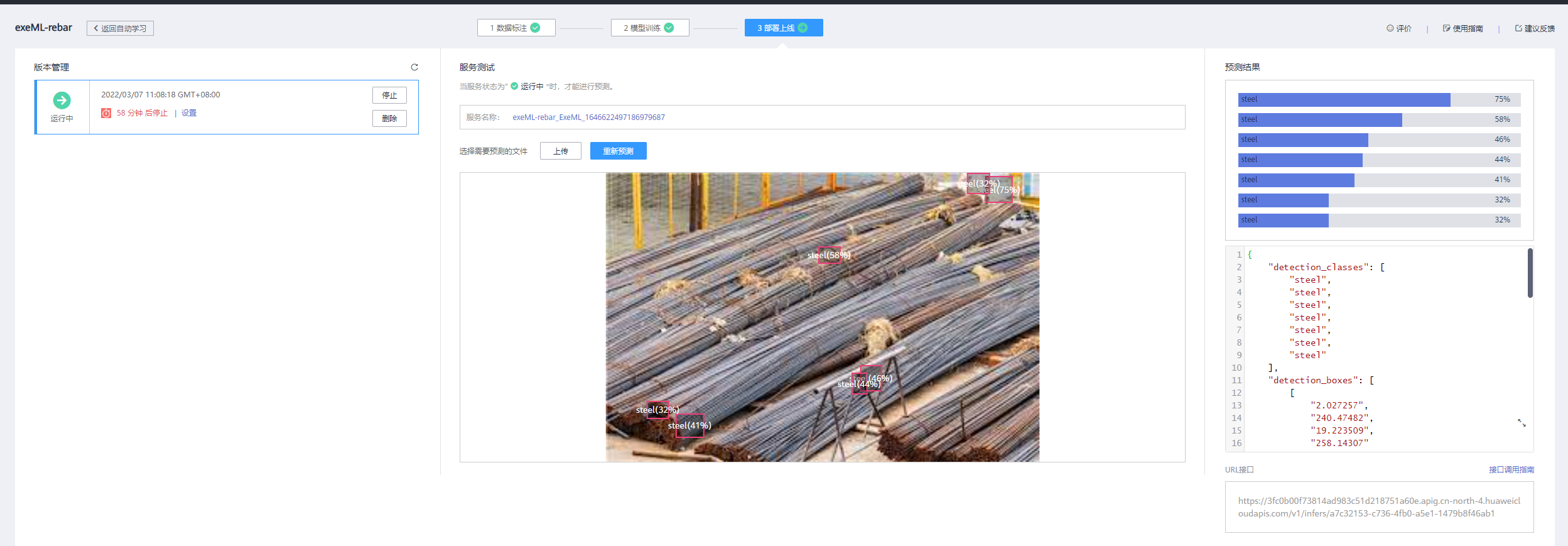 【摘要】 ModelArts准备工作在使用ModelArts之前,您需要做如下工作:注册华为云账号、完成ModelArts全局配置、以及熟悉OBS相关操作。下载“钢筋检测数据集”训练数据创建项目模型训练部署上线测试样例图片查看在线服务关闭在线服务实验完成后,为了防止继续扣费,点击“停止”按钮,把在线服务关闭,在线服务停止后可以重新启动。