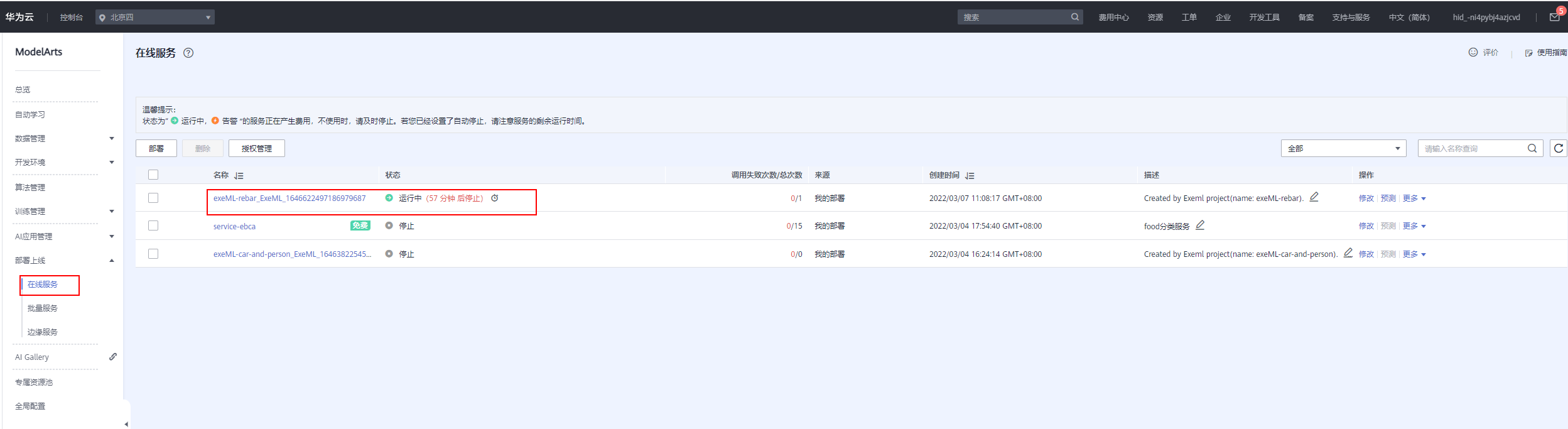 实验完成后,为了防止继续扣费,点击“停止”按钮,把在线服务关闭,在线服务停止后可以重新启动。