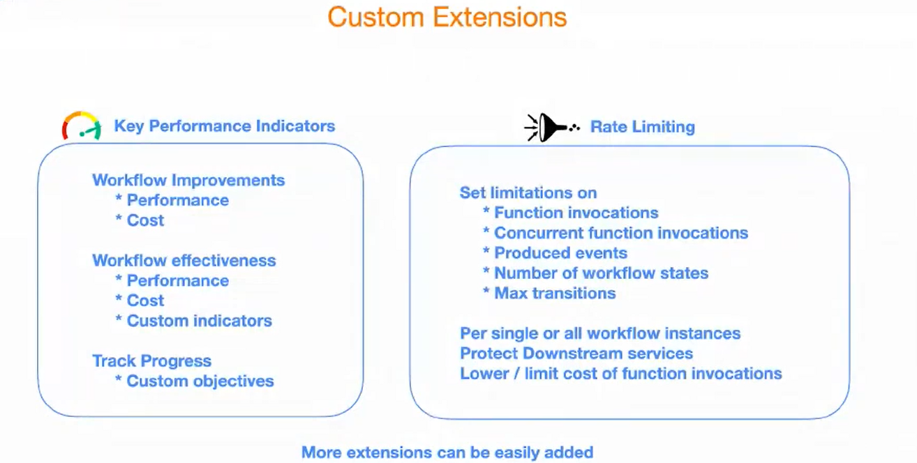 除了上述核心的控制流逻辑,CNCF Serverless Workflow规范也提供了自定义扩展能力。目前社区规范提供两个拓展:关键性能指标和限流。