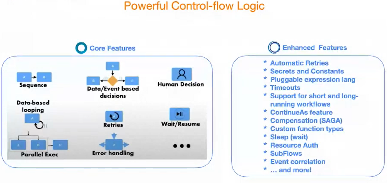 CNCF Serverless Workflow规范本身提供了非常强大的控制流逻辑,包括了大多数业界支持的核心功能,如顺序执行,以便用户可以定义流水线。在顺序执行的基础上,用户也可以定义并行的执行,如并行调用函数或微服务。另外,也支持使用不同种类的循环结构执行数据库循环调用之类的工作流。此外,重试、错误处理、工作流的手工干预,还有诸如等待和恢复之类的标准能力都被CNCF Serverless Workflow的规范所支持。