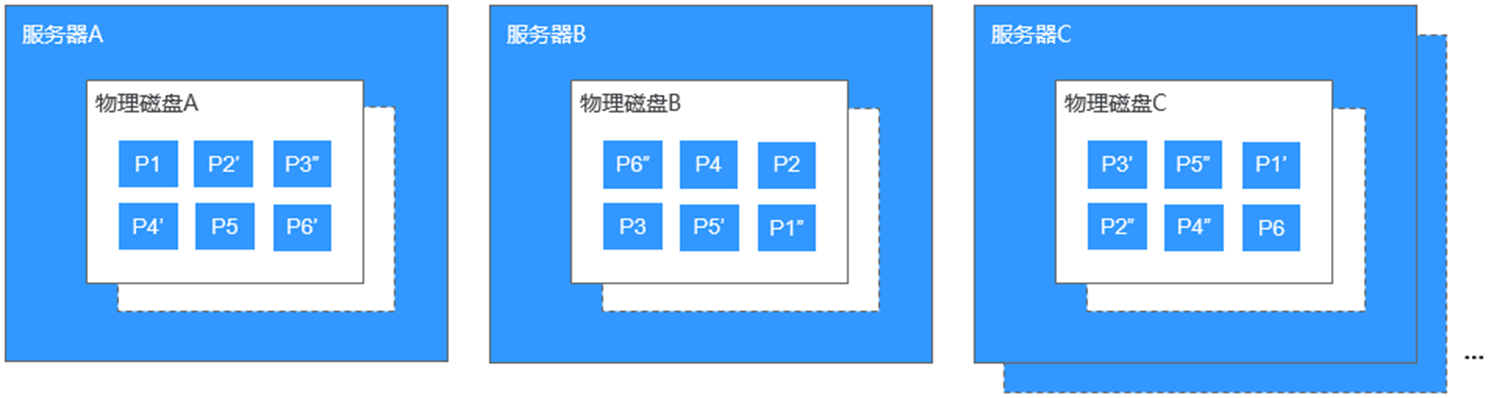 例如,对于服务器A的物理磁盘A上的数据块P1,系统将它的数据备份为服务器B的物理磁盘B上的P1''和服务器C的物理磁盘C上的P1',P1、P1'和P1''共同构成了同一个数据块的三个副本。若P1所在的物理磁盘发生故障,则P1'和P1''可以继续提供存储服务,确保业务不受影响。