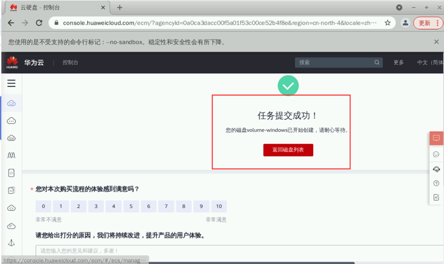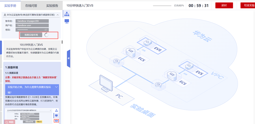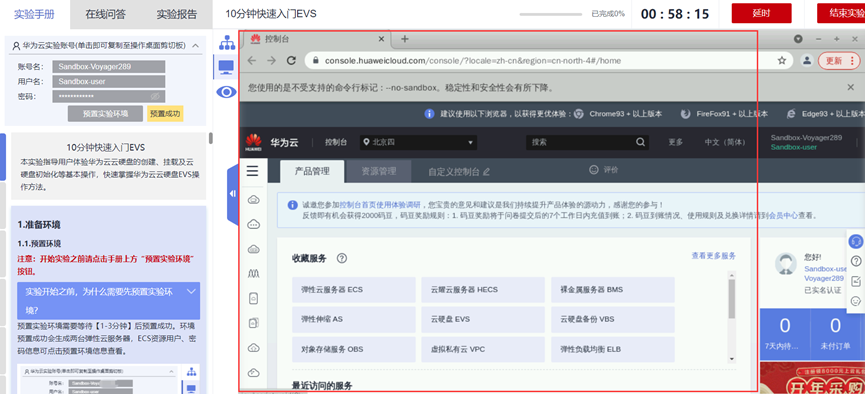 进入界面【实验操作桌面】,首先预置实验环境,约3分钟后会预置完成。然后打开Chrome浏览器,首次可自动登录并进入华为云控制台页面。
