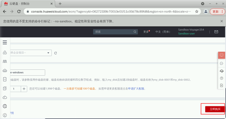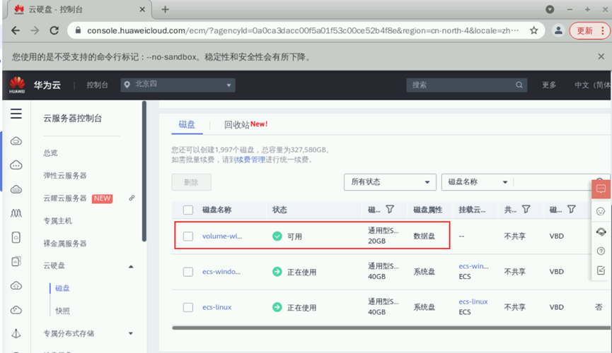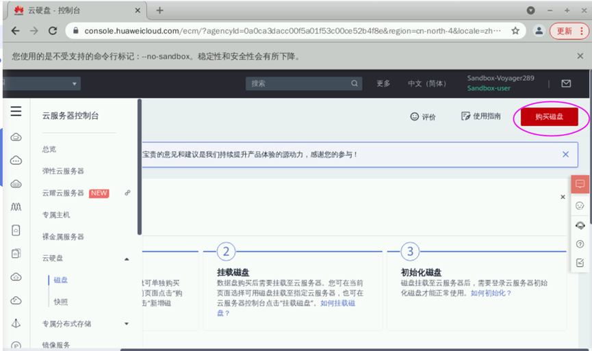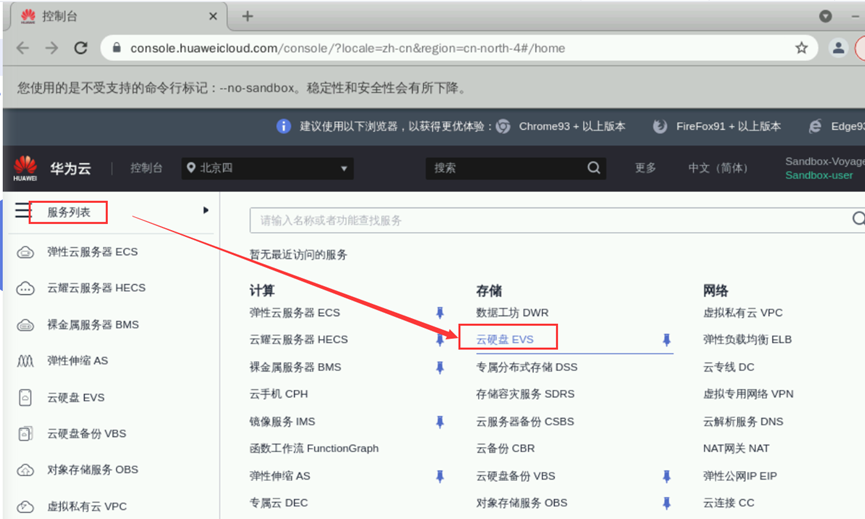 购买云硬盘EVS登录管理控制台,鼠标移动到实验操作桌面浏览器页面中左侧菜单栏,选择“服务列表>存储 > 云硬盘EVS”。进入云硬盘EVS页面。