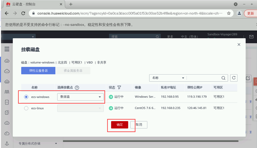 选择云硬盘EVS待挂载的弹性云服务器ECS,此处我们选择ecs-windows,该弹性云服务器ECS必须与云硬盘EVS位于同一个可用分区,通过下拉列表选择“挂载点”,挂载点为数据盘,单击“确认”。