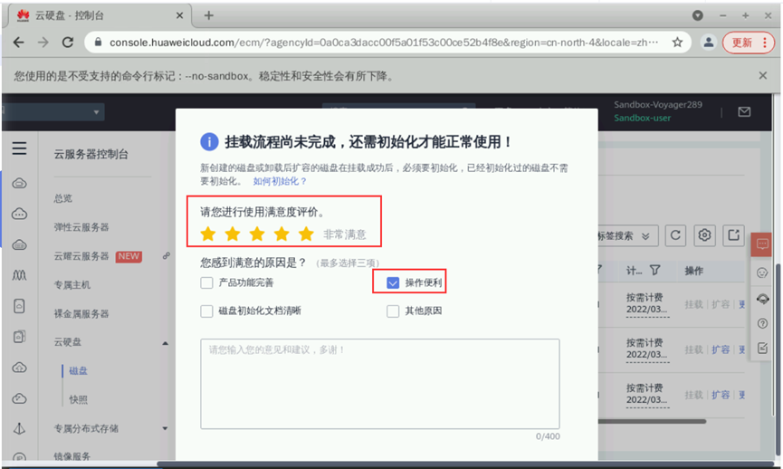 云硬盘EVS挂载至弹性云服务器ECS后,需要登录弹性云服务器ECS初始化云硬盘EVS,即格式化云硬盘EVS,之后云硬盘EVS才可以正常使用。