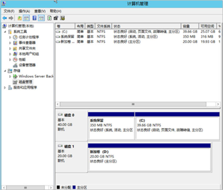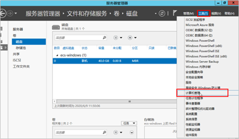 在弹性云服务器ECS桌面,页面下滑选择“开始”,在菜单列表中选择“服务器管理器”,然后文件和存储服务->磁盘->工具 -> 计算机管理。
