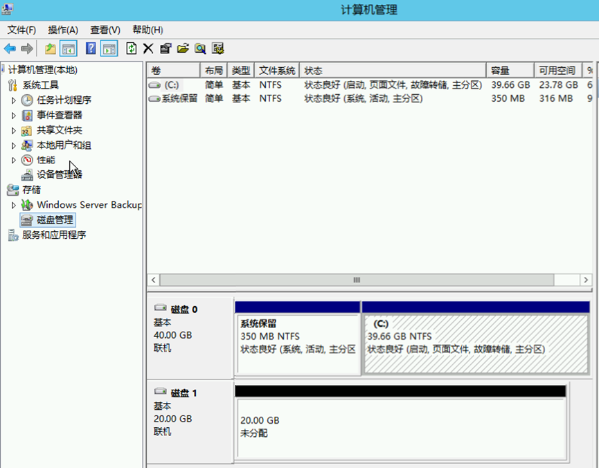 在左侧导航树中,选择 存储 –> 磁盘管理。