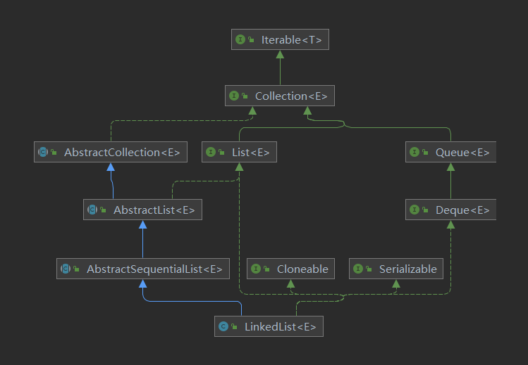 java.util.LinkedList 是 Java 集合框架中的成员之一,底层是基于双向链表实现,集合容量可动态变化的。它继承自 AbstractSequentialList 抽象类,实现了 List 接口。同时还实现了 Cloneable 和 Serializable 三个标记接口,说明 ArrayList 是可克隆复制的,可序列化的。