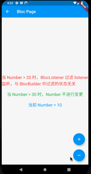 BlocListener 与 BlocBuilder 应用有相似之处;其中 listener 用于监听状态变更,可在此做出相应的业务处理;