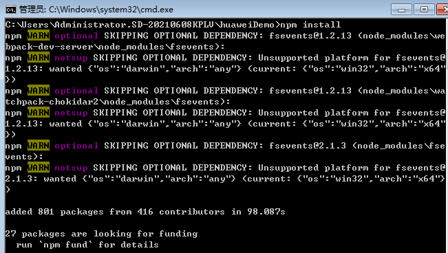 构建成功后,接着需要进入这个项目的路径,下载npm的依赖包,耐心等待一会