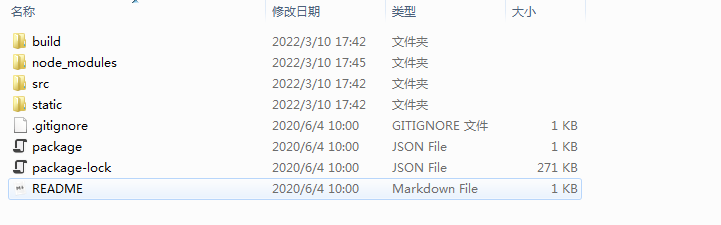 该项目包含了以下的文件,其中 build目录是用于存放编译后的文件的,node_moudules就是我们刚刚下载的npm依赖包,scr放的是主要的index文件,static存放一些静态文件和图片,剩下的都是配置文件,尤其是package.json