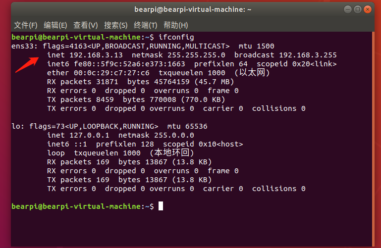 打开终端,查看ip地址为:192.168.3.13 (每个人的地址不一样)