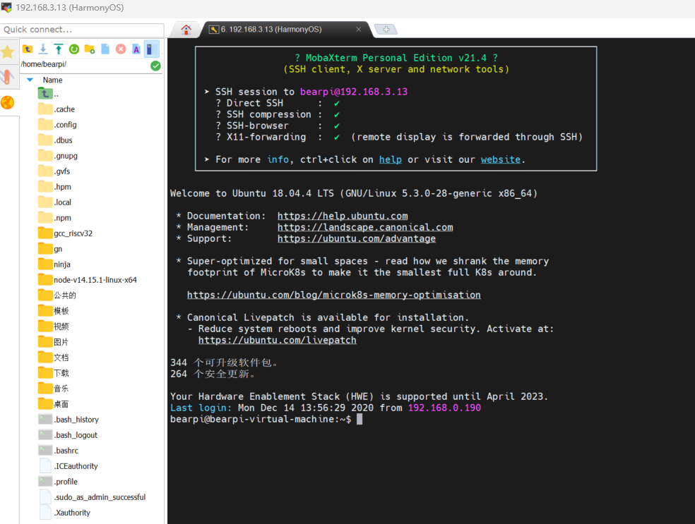 配置MobaXterm的SSH终端,连接该虚拟机:用户名bearpi,密码bearpi