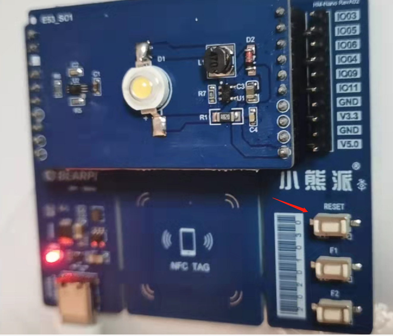 此时需要按一下小熊派上的RESET按钮(倒数第三个按钮)