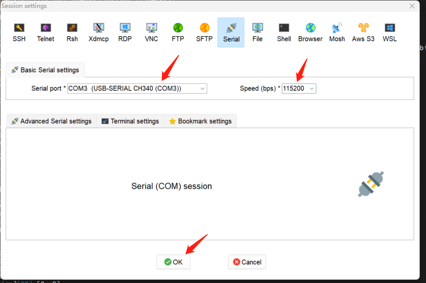 打开MobaXterm, 选择Serial类型连接:
