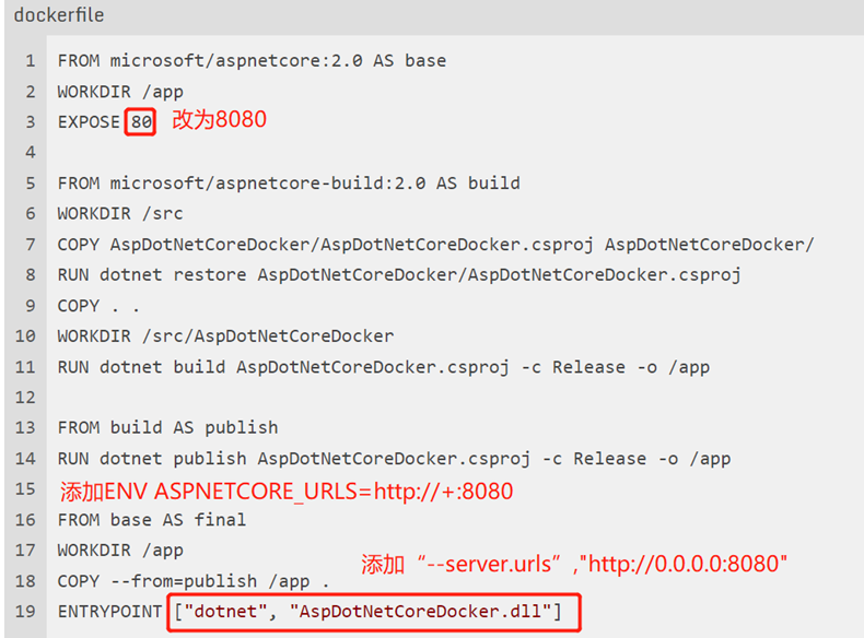 此处需要按照华为给定的示例文档将监听ip设置为 "0.0.0.0", 对外监听的端口设置为 8080,故需要对dockerfile文档进行修改: