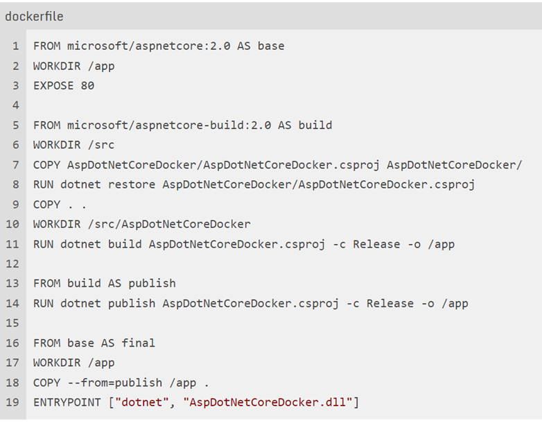 同时,ASP.NET Core 项目文件夹下自动生成了一个名为 Dockerfile 的文件(注意这里是自动生成的),该文件起始包含 4 个单独的生成环节,其根据 Docker multi-stage build 定义,内容如下: