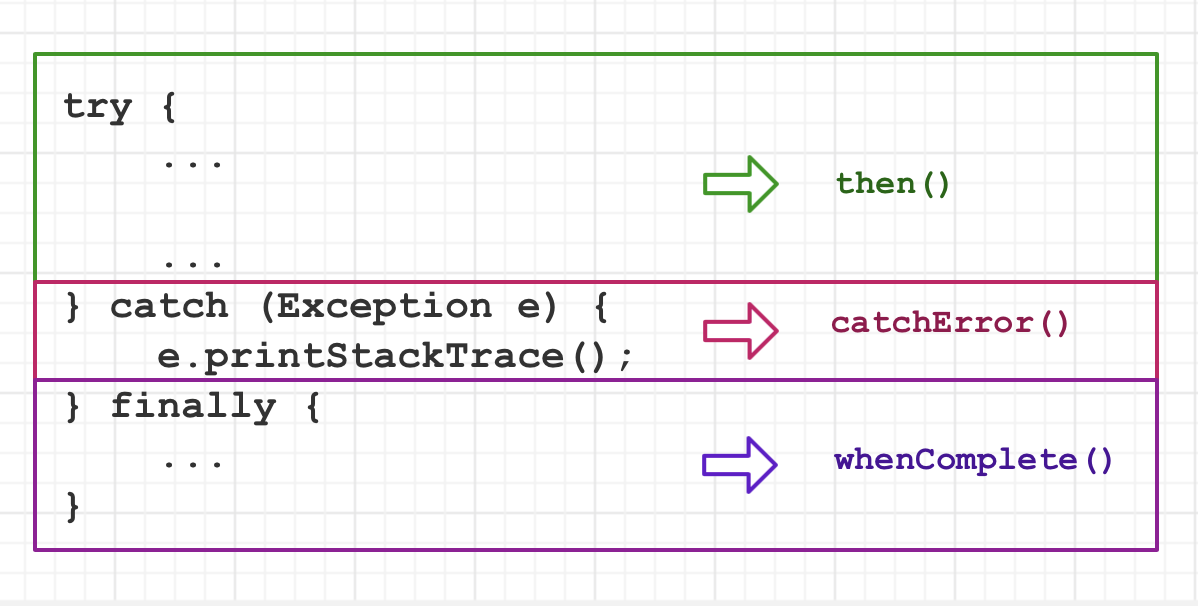 小菜做了一个不太严谨的对比,这三种状态类似于 try-catch-finally,其中 try 对应 then() 成功回调,catch 对应 catchError() 异常回调,而 finall 对应 whenComplete() 最终回调;