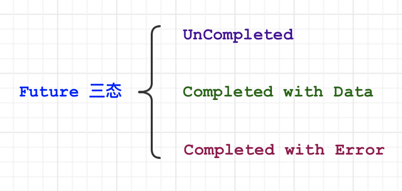Future 的应用主要涉及三种状态,分别是未完成状态(UnCompleted / Pending),完成成功(Completed with Data),完成失败(Completed with Error);