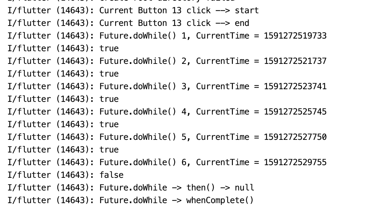 print('Future.doWhile() $i, CurrentTime = ${DateTime.now().millisecondsSinceEpoch}');