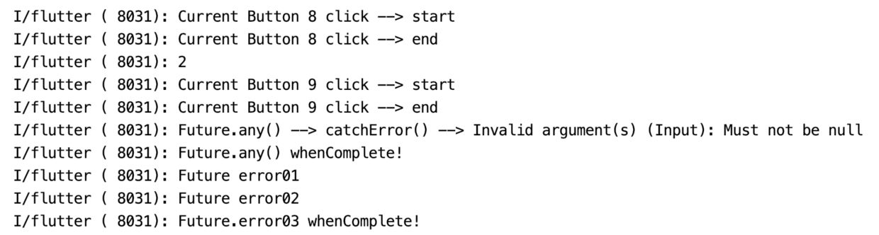 静态方法 any() 是 Futures 数组中完成第一个 Future 的回调监听,包括成功回调 then() 和异常回调 catchError(),其中第一个 Future 完成之后,并不影响其他的 Future 执行;