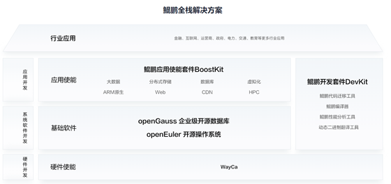 鲲鹏全栈解决方案,主要应用在金融、互联网、运营商、政府、电力、交通等行业。其中应用使能套件BoostKit可应用于大数据、分布式存储、数据库、虚拟化ARM原生等方面。基础软件可应用于openGauss企业级开源数据库、openEuler开源操作系统。开发套件DevKit包含鲲鹏代码迁移工具、鲲鹏编译器、鲲鹏性能分析工具、动态二进制翻译工具。