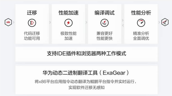开发套件DevKit包含鲲鹏代码迁移工具、鲲鹏编译器、性能分析工具、动态二进制翻译工具等。