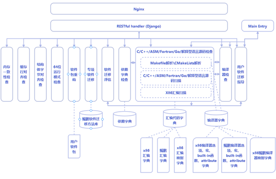 源码迁移:能够自动检查并分析出用户源码、C/C++/ASM/Fortran/解释型语言/汇编软件构建工程文件、C/C++/ASM/Fortran/解释型语言/汇编软件构建工程文件使用的链接库、x86汇编代码中需要修改的内容,并给出修改指导,以解决用户代码兼容性排查困难、迁移经验欠缺、反复依赖编译调错定位等痛点。