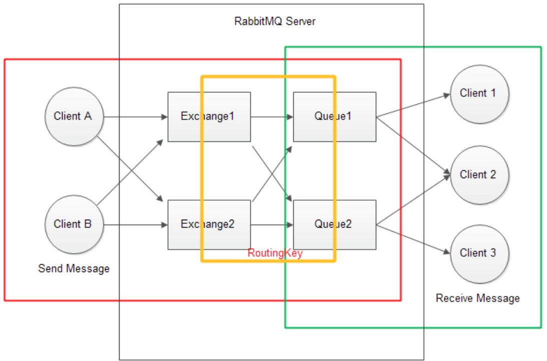 - 客户端使用routing key,在exchange和queue之间建立绑定好关系。