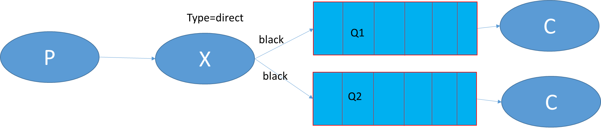 多个队列绑定相同的routingKey是允许的,在上述实例中,可以把X和Q1用routingKey:black绑定起来,这种情况下,direct exchange将像fanout类型的exchange一样会将消息广播都到所有匹配的queues中,即一个routingKey为black的消息将会被发送到Q1和Q2中。