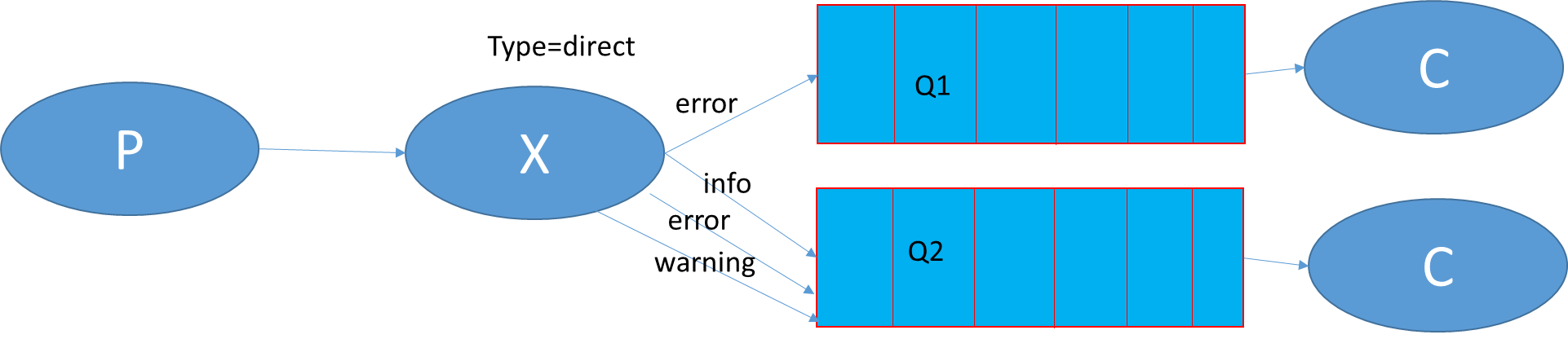 为此将使用一个direct exchange来代替fanout exchange,direct exchange使用简单的路由算法,将消息通过绑定的Key匹配将要到达的队列。