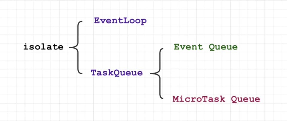 Dart 是单线程的,一个 Flutter 程序由一个或多个 isolate 组成,默认的执行方法均是在 main isolate 中;一个 isolate 中包含一个 Event Loop 和一个 Task Queue,而 Task Queue 包含 MicroTask Queue 微事件队列和 Event Queue 事件队列两种;