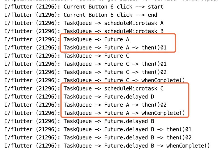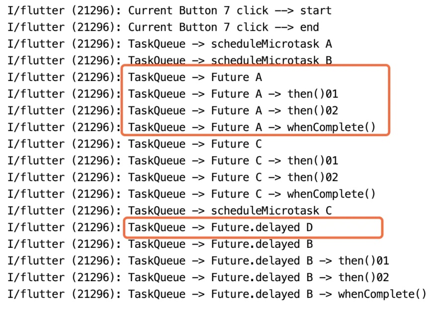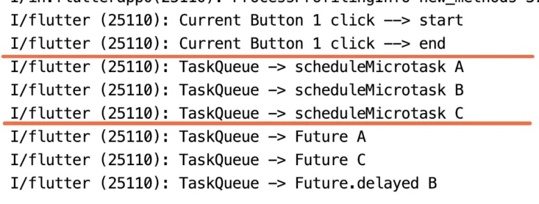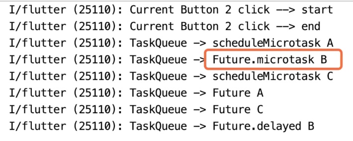 根据上述执行顺序,首先执行 main() 中同步的日志输出 Click start -> end,之后优先执行 MicroTask 微事件 scheduleMicrotask A -> C;再之后执行添加到 EventTask 事件队列的 Future() 构造函数 Future A -> C;最后执行因延迟 2s 加入事件队列的 Future B;