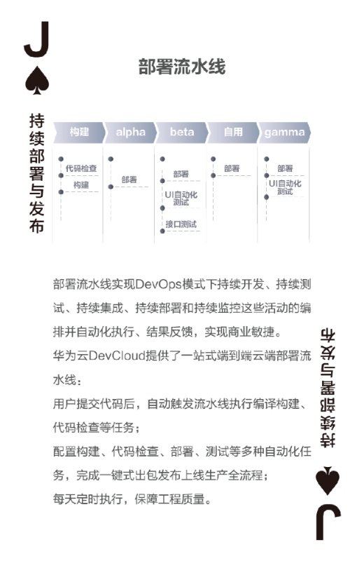 华为云DevCloud提供了一站式端到端部署流水线:用户提交代码后,自动触发流水线执行编译构建、代码检查等任务;配置构建、代码检查、部署、测试等多种自动化任务,完成一键式出包发布上线生产全流程;每天定时执行,保障工程质量。