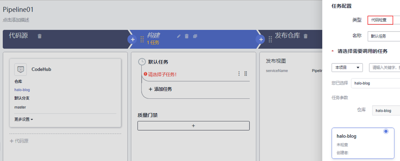 3.进入工作流配置页面,在构建阶段,选择类型为“代码检查”,然后添加已创建的代码检查任务。