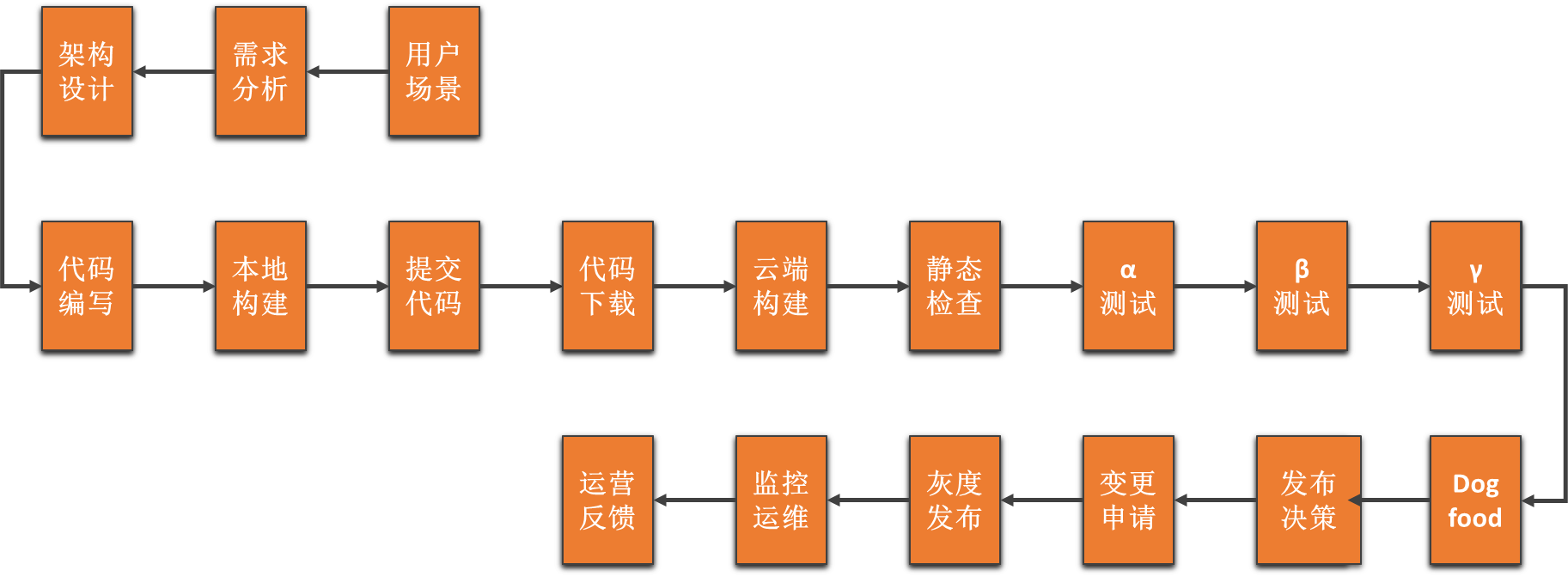 构建一条部署流水线,首先要根据软件架构和业务特点,确定流水线的各个环节内容,如下就是某产品开发的流程设计。从大框架上需要包含构建、部署、测试和发布这几个环节。其中构建包含代码提交、本地构建、云端构建、静态检查、单元测试;部署包括测试环境的部署,α、β、γ环境部署。各环境中的测试实施,其中“Dog food(吃狗粮)”是互联网公司的一种文化,指的是自研自用,即部署到内网环境,供大家使用;发布包括依据发布策略,实施发布。如下图所示。