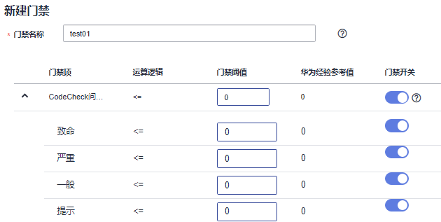 5.填写门禁名称(如:test01),并将代码检查任务对应的门禁项“CodeCheck问题数”开关打开,保存并选择已创建的门禁。