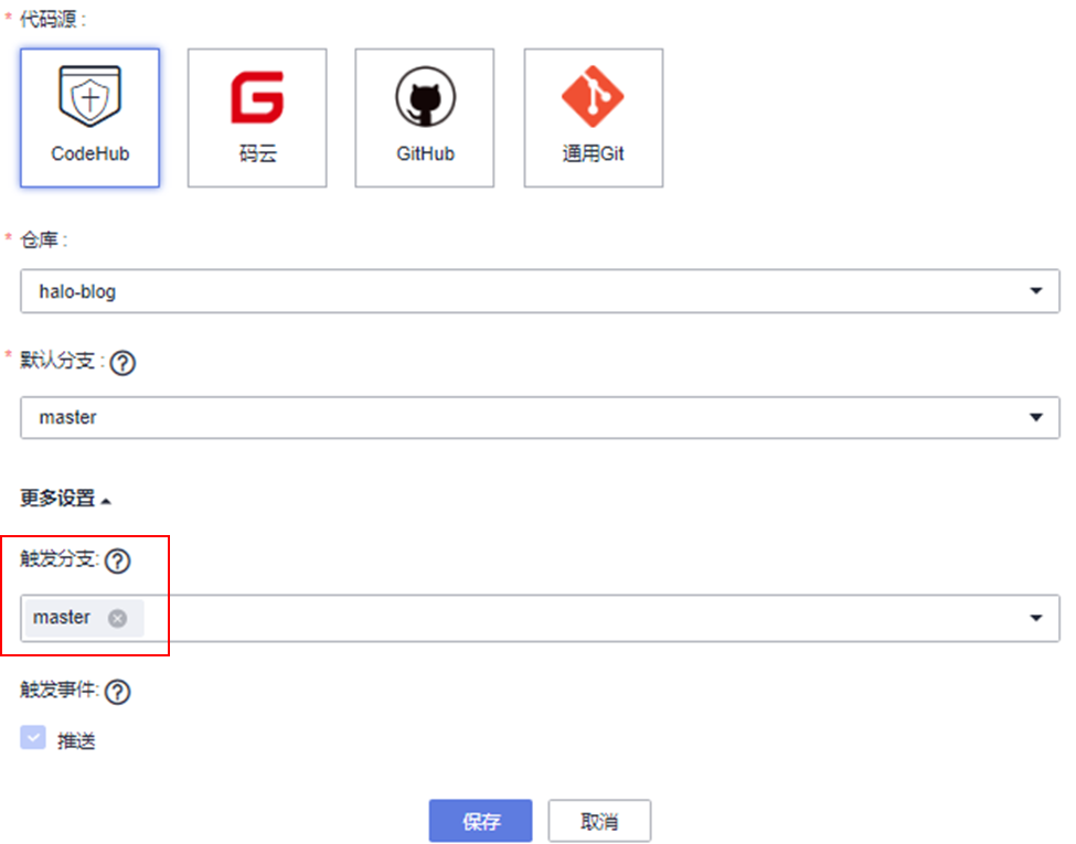 展开“更多设置”,在触发分支中选择关联仓库的指定分支,如:“master”。保存流水线后触发器即刻生效,当指定仓库分支中有代码提交时,会自动触发关联流水线执行。