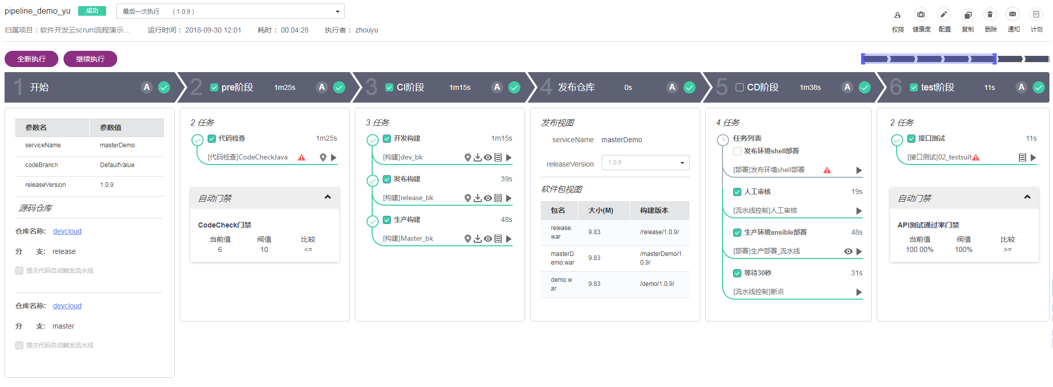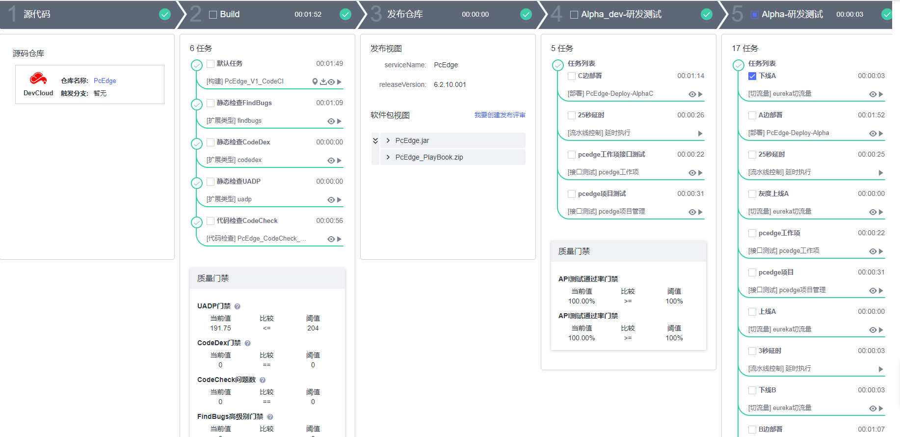 最后将各个环节统一编排成流水线,设置质量门禁,实现提交代码即触发自动部署的功能。