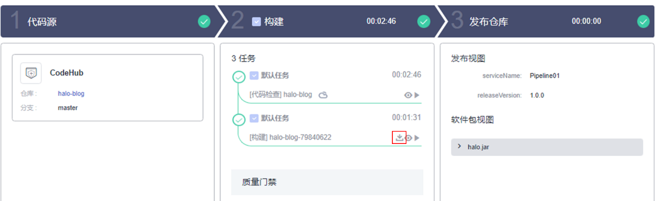 以快速上手流水线为例,在这个流水线中,包含代码检查、构建和质量门禁设置三个环节,其中的代码检查和构建是已经创建好的任务,质量门禁可以在创建流水线的同时创建。下面演示是如何创建和执行流水线。