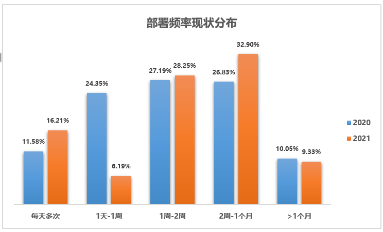 根据《中国 DevOps 现状调查报告(2021)》,大概有六成受访者所在的企业部署频率为1周到1个月1次,同比2020年增长了近一成。仅有16.21%的企业能够每天多次在生产环境进行部署;此外,9.33%的企业部署频率超过 1 个月。