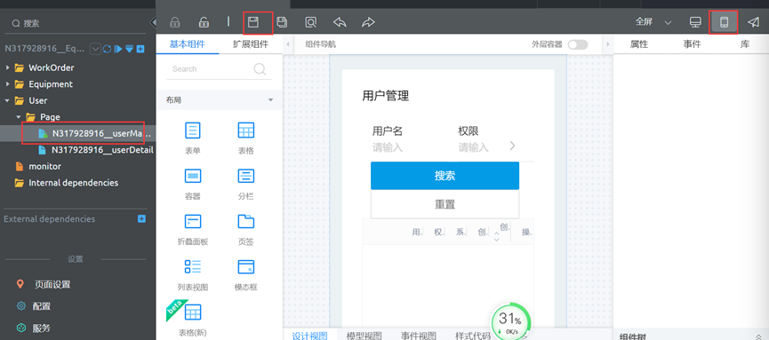修改要发布的页面模式,单击“Page”目录下的“Page”页面,单击页面,切换页面布局模式为手机模式,单击。