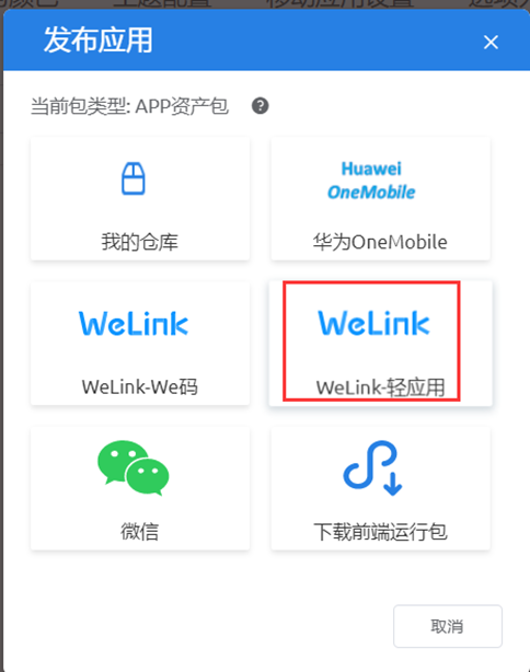 - 在AppCube上编译发布应用,将创建的应用编译发布到WeLink上。