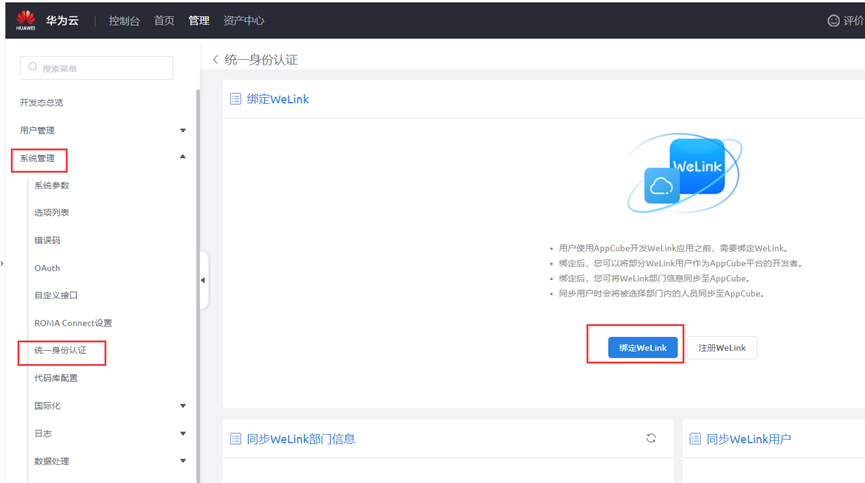 以租户帐号登录AppCube开发环境,在“管理”下,绑定WeLink并同步WeLink信息。