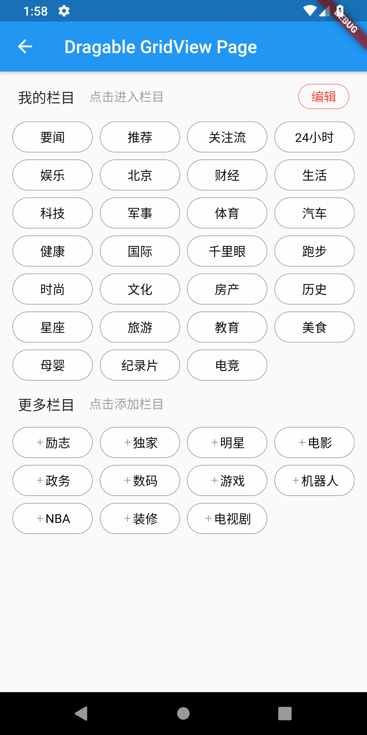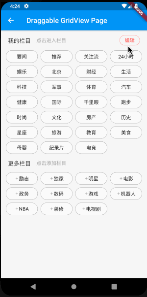 网格列表就是最常用的 GridView;小菜设置两个 GridView 分别存储【我的栏目】和【推荐栏目】;其中标签 item 的点击事件和拖拽事件并不冲突;