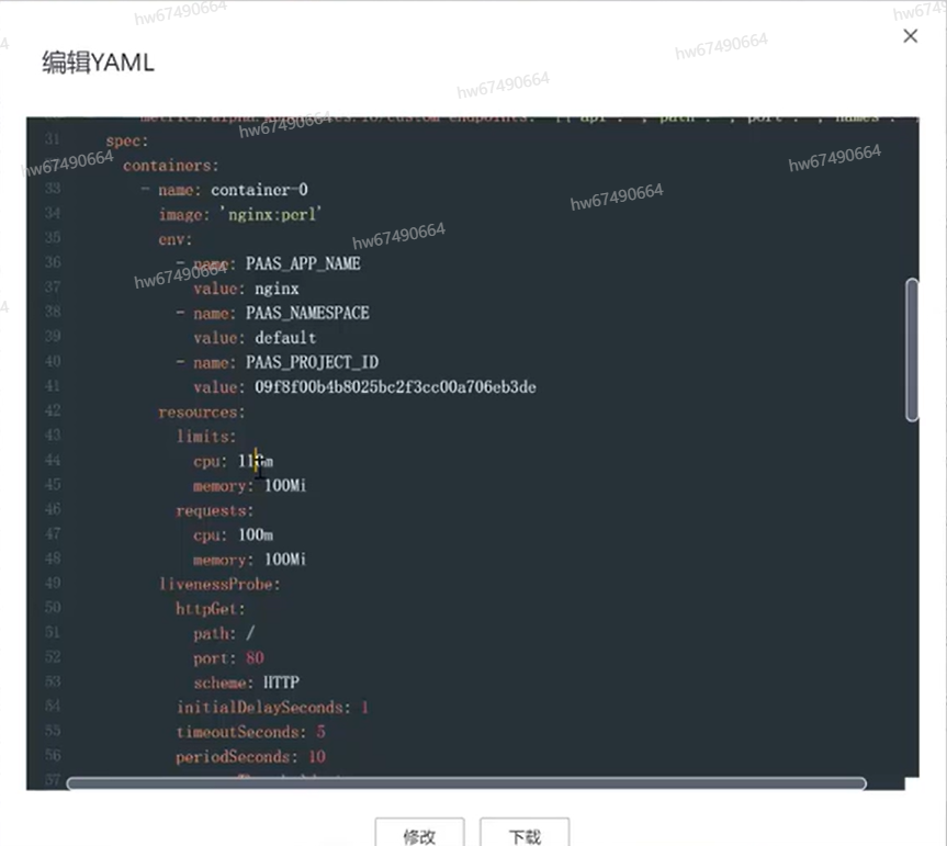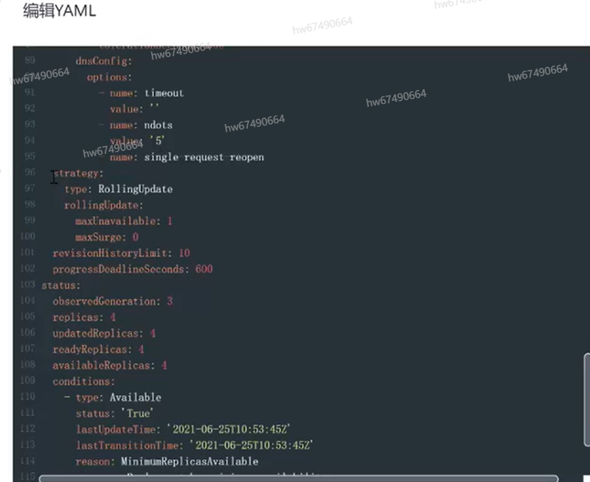 现在有4个节点正在运行中,我们要对其中节点进行回滚我们看下他的历史版本,可以看出deployment nginx是有两个版本,我们想回退到第一个版本,现在已经提示我们节点已经开始回滚,我们可以看一下当前节点情况,节点已经开始滚动回滚,回到页面YAML编辑中看到,CPU limit已经回滚到100;