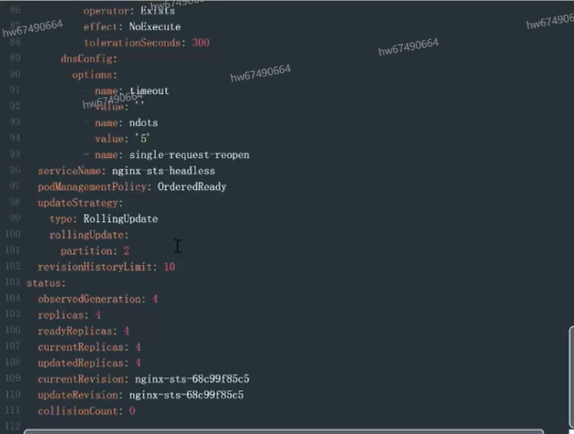 - 支持部分实例滚动更新,部分不更新,通过spec.updateStreategy.rollingUpdate.partition指定一个index分界点,所有id大于等于partition指定的值的Pods将会进行滚动更新;所有id小于partition指定的指的Pods将保持不变