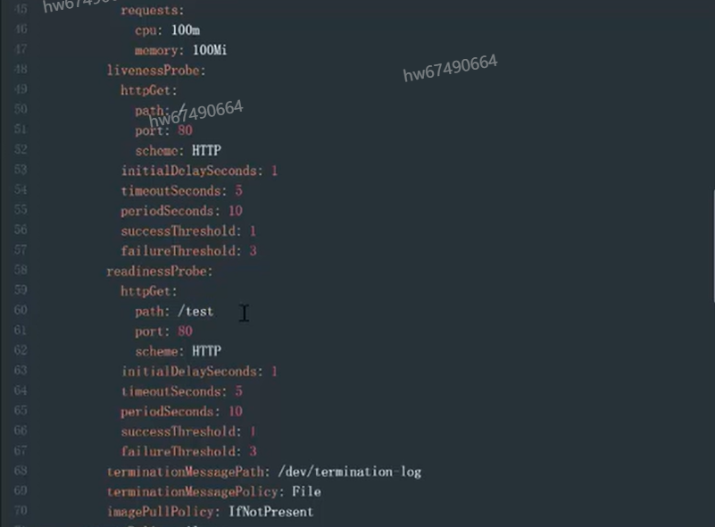 看下当前nginx探针,查看yaml文件配置,可以明显看到livenessProbe也就是存活探针配置是七层的HTTP探针,它的PATH是根,端口是80,然后你看下面是readinessProbe这是业务探针也是一样的,业务也是正常运行。如果现在我们把业务探针改为一个错误的PATH路径,比如说改成/test,这个路径是不存在七层的HTTP接口,这个时候返回的状态码是404才对