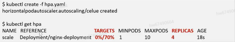 上面有几个字段,比如有最大副本数量,最小副本数量,还有需要的资源,CPU,目标值是70%,配置后给一个工作负载Pod来创建它的HPA,当我们创建后查看HPA,命令如下这种