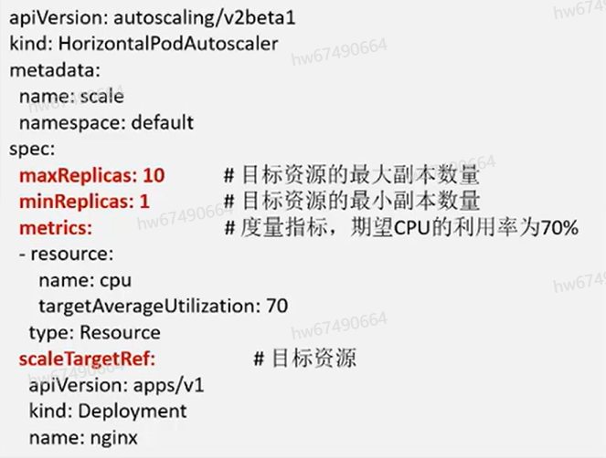 好我们这里有个HPA示例,创建一个HPA,期望CPU的利用率是70%,副本数的范围是1-10,如下图所示